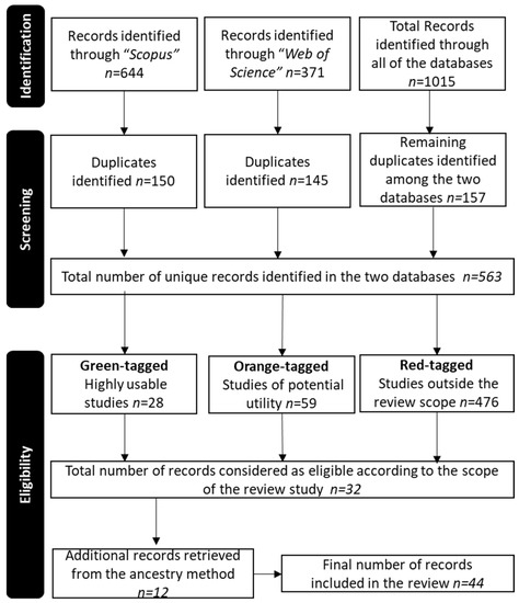 Finally, the ancestry method [51] was also adopted, according to which we searched the references of the identified research articles for empirical studies that could be included in the present review. This process yielded 12 additional articles. Overall, a total of 44 empirical studies met all the inclusion criteria and were selected for this review.
