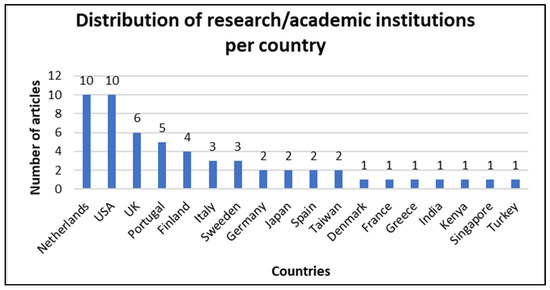 As presented, twenty-three of these articles were published in journals (52.3%), while twenty-one articles in conference proceedings (47.7%). The vast of majority of the reviewed articles were mainly published in computer/informatics (n = 16, 36.3%) or environmental-related journals and conferences (n = 10, 22.7%), followed by a smaller corpus of articles which were published in journals and conferences related to education (n = 6, 13.6%), human–computer interaction (n = 5, 11.4%), games (n = 5, 11.4%), psychology (n = 1, 2.3%) and design (n = 1, 2.3%). Focusing on the publication dates, a total of 8 articles were published between 2007 and 2011 (18.2%); another 13 articles were published during 2012–2016 (29.5%), while 23 articles were published during 2017–2021 (52.3%). A considerable peak in the published articles can be observed during the last 5 years (2017–2021), indicating the increasing interest in the topic as well as the emerging nature of research in this field. Finally, as presented in Figure 3, most of the research/academic institutions which conducted the reviewed articles were found in Netherlands, USA, and UK.