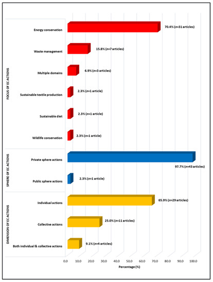 In their vast majority, these actions were mostly focused on energy conservation (n = 31 articles, 70.4%), as well as on waste management (n = 7 articles, 15.8%). In addition, focusing on the sphere of the EC actions, almost all the reported EC actions were classified in the private (n = 43 articles, 97.7%), rather than in the public sphere (n = 1 article, 2.3%). Put simply, most of the reported EC actions were found to affect the relations between individuals and societies (e.g., saving energy, recycling, following a more sustainable diet), rather than affecting the relation in societies (e.g., lobbying local councils and policymakers, participating in environmental campaigns, voting for environmental issues). Finally, we have found that most of the reviewed articles report on individual EC actions (n = 29 articles, 65.9%), namely actions taken on an individual basis, but a significant portion of articles also report on BCGs which supported collective actions (n = 11 articles, 25%).