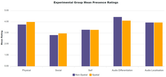 Differences between mean ratings from the Multimodal Presence Scale (MPS) subscales or the additional audio questions. No significant difference was observed between the non-spatial and spatial conditions in the experimental group with overlaid vehicle sounds, suggesting that the spatialisation of ambient audio and vehicle sounds did not impact presence.