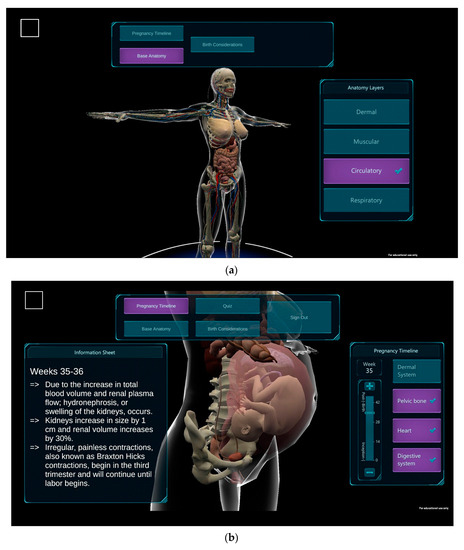 Interactive and modifiable organ systems included cardiovascular, dermal, digestive, mammary, respiratory, and urinary systems. Additionally, the uterus, placenta, and developing fetus were also designed for user interaction and modification [20]. The anatomy function enabled the user to remove various anatomic layers to better understand structural relationships during various gestational ages. A floating information panel provided additional context regarding the underlying rationale for these changes [20]. Maternal anatomic organ system modeling was developed using commercially available anatomical models, including Anatomy Learning—3D Anatomy, Complete Anatomy (Amsterdam, Netherlands), Anatomy 3D Atlas (Milano, Italy), and 3D Organon VR Anatomy (San Francisco, CA, USA), that were manipulated and animated in Unity 3D™ (Austin, TX, USA) using C# visual programming language [20].