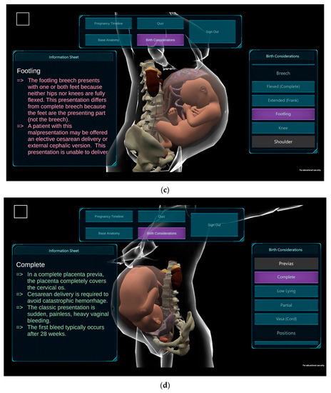 Road to Birth digital anatomy interfaces: (a) base anatomy, (b) pregnancy timeline, (c,d) birth considerations, and quiz mode (not shown).
