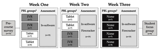 A PBL curriculum differs from traditional approaches by integrating the learning of anatomical sciences through an aligned theme or body system [3]. This approach uses active learning organized around problems (e.g., patient cases, professional problems, and/or scenarios) among small groups of students rather than among large lecture groups [3]. Additionally, the coronavirus disease of 2019 (COVID-19) pandemic significantly impacted traditional “on-campus” anatomical sciences teaching, accelerating the adoption of digital technologies out of an adaptive necessity [4]. Moreover, emerging evidence suggests that the use of technology for teaching anatomy has become popular, allowing students more interactivity [4]. Some students are motivated by the integration of immersive virtual reality (IVR) in which the user is immersed in a virtual world using a head-mounted display (HMD) and augmented reality (AR) which projects a digital image over the already visible reality, thus augmenting what the user can see [4]. Though students demonstrate superior memory retention when using these technologies compared to learning from a textbook [4,5] and non-immersive (e.g., computer-based desktop) virtual reality approaches [6,7], less is known about the integration of technology-enabled approaches within a PBL curriculum.