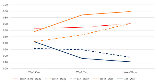 The median student performance on RtB in-software weekly quizzes and Firecracker weekly quizzes were all above the passing threshold (70% correct on average) and are shown in Table 2. The median quiz time, as measured by the device, was compared by platform modality, IVR vs. tablet: week one 14.7 vs. 14.5 min; week two 7.5 vs. 13.1 min; week three 10.5 vs. 14.3 min (Figure 4).