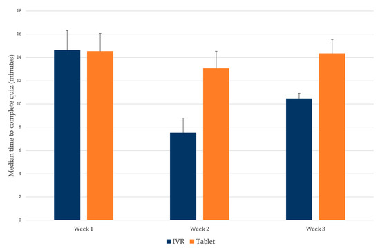 Median in-software quiz time by week. Black bars represent standard error. Abbreviations: IVR: immersive virtual reality.