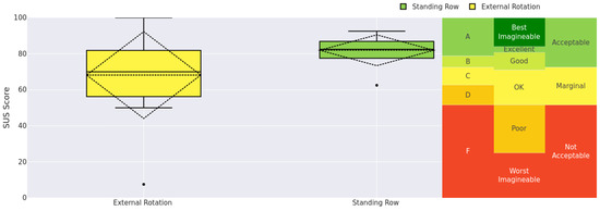 In Figure 7, we see that the data are more dispersed in the “External Rotation” group, and the outliers are extreme, with one in the worst possible category and the other in the best. The average for this is set to OK. On the other hand, we have the “Standing Row” group with a low dispersion on the data and high values of usability: a SUS Score of 81.94 out of 100.