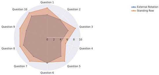 From the data visualization from Figure 8, we can see that in both cases, Question 2 and Question 4 achieved the worst results. These are areas where we can improve. Question 2 says that the system is too complex and Question 4 is related to the need for a technical person to help while using the system. Overall, “External Rotation” performed worst in every point, except on Question 6, which was slightly higher, which is related to the system inconsistency.