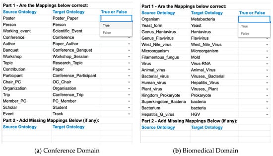 In the experiments, a participant needed to evaluate whether a given mapping was indeed correct in the form of true or false questions and generate additional mappings if the given set was deemed to be incomplete.