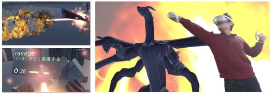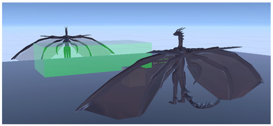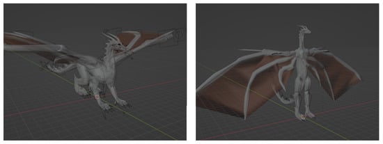 To realize “becoming a nonhuman avatar”, it is necessary to have a 3D model of the non-human avatar that follows the movements of the HMD and controllers. In this study, a dragon avatar was used as an example of a non-human avatar. This avatar was chosen because its significantly taller stature than that of humans provides a different self-perspective and allows for the inclusion of many actions that are not typically experienced by humans, such as flying and breathing fire. The 3D model of the dragon is shown in Figure 3. It was a quadrupedal 3D model and difficult to implement as an avatar in its original form. Therefore, a humanoid rig was created using Blender. The edited 3D model was exported as an FBX file and imported into Unity, where it was implemented as a dragon avatar using 3-point tracking with VRIK, a feature of Final IK. The wings were designed to move in conjunction with the arms, and the tail was designed to sway with body rotation.