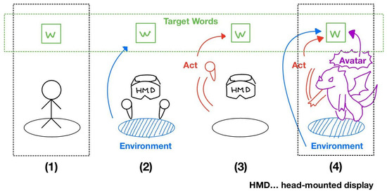 Recently, with the proliferation of head-mounted displays (HMDs), research incorporating immersive virtual reality (IVR) into language learning using these technologies has been increasing. According to The American Heritage Dictionary, the term “Virtual” is defined as “Existing or resulting in essence or effect though not in actual fact, form, or name”, meaning that VR can be defined as a technology that reproduces the essence of reality. However, IVR is described as “technology that allows the user to experience physical and/or behavioral simulations” [9] and is primarily realized through devices such as HMDs or Cave Automatic Virtual Environments. In IVR, it is possible to learn vocabulary that is rarely experienced in the real world by freely changing objects and spaces. Studies that utilize IVR for vocabulary learning have presented words related to the virtual environment [10,11] and virtual objects [12,13]. Moreover, because IVR can easily create immersive environments, learning through enactment is advantageous for vocabulary retention. However, these prior studies have focused on changing objects or environments, and there has been little examination of variables such as the first-person perspective of the learner or the avatar used. The avatars used were either human or reproduce parts, such as the hands. Therefore, the possible virtual experiences are limited to “learning experiences from a human perspective”, and the vocabulary assumed in these studies is fundamentally related to humans.