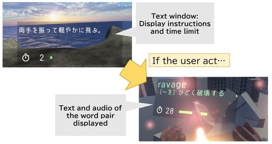 A rectangular, semi-transparent text window showing instructions for the actions and time limit was always displayed in the learner’s view. The text window followed the movement of the HMD and was always displayed in front of the learner. However, to prevent hindering the IVR experience, the user interface (UI) was designed to be semi-transparent, such that objects could still be seen through the UI. When the user performed the actual action, the English word and its Japanese translation were displayed within the text window (see Figure 5).