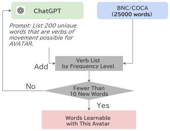 Although transitive verbs suitable for each avatar can be selected manually, the sheer number of words makes this impractical. Therefore, ChatGPT was used. The steps for selecting English words using ChatGPT are as follows: To select avatar-specific English words, the prompt “List 200 unique words that are verbs of movements possible for AVATAR”. was input, and this task was repeated until fewer than ten new words appeared in the BNC/COCA list. The term “AVATAR” in the prompt was replaced with the name of the avatar being used. For example, “the creature dragon” was substituted for the dragon avatar used in this study.