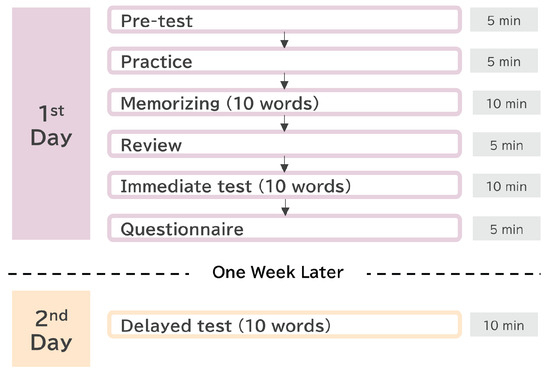 To eliminate the learning effect due to the order of word presentation, the order of words in the pre-test, learning, review, immediate test, and one-week post-test were all randomly arranged. All answers were collected using Google Forms. To avoid predicting the correct answers through predictive conversion, the keyboard’s predictive conversion option was turned off and the browser’s private mode was used.