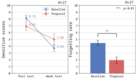Figure 9 (left) shows that under the baseline approach, the average number of correct answers decreased from 8.15 words to 3.69 words in 1 week, that is, the average forgetting rate was 4.46 words. However, in the proposed method, the average number of correct answers decreased from 6.93 words to 5.00 words in one week, that is, the average forgetting rate was 1.93 words.