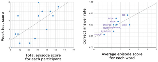 The evaluation method for the word tests followed that adopted in previous studies [12,43], and the scores of the immediate word test and one-week post-test were used for the evaluation. Because all participants scored zero in the pre-test, the correct answer rates of the word tests conducted immediately after learning and one week after learning were used as word test scores. The forgetting count was obtained by subtracting the immediate test score from the one-week test score.