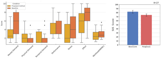 The system evaluation was conducted using the system usability scale (SUS) [47], which is a commonly used standard measure for system evaluation. It consists of ten questions, with odd-numbered questions being positive and even-numbered questions being negative. The system usability scale (SUS) scores were calculated by subtracting 1 from the odd-numbered question scores and subtracting the even-numbered question scores from 5, summing these scores, and multiplying by 2.5 to obtain a score out of 100. A score of 70 or above indicated that the system was acceptable.