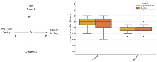 Subjective emotional evaluation was conducted using the Affect Grid [48], which evaluates the nature of emotions on a two-dimensional coordinate system, typically on a 9 × 9 grid. The vertical axis evaluates alertness (alertness-sleepiness), and the horizontal axis evaluates emotional value (pleasure-displeasure). In this experiment, the participants answered the Affect Grid before and after the experiment on the first day to evaluate the changes in subjective emotions.