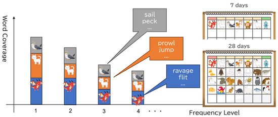 Two datasets were used in this experiment. First, we verified the extent to which a given number of avatars could be used to learn English words until saturation. By using the 25,000 English words included in the BNC/COCA word family [39], we investigated the coverage rate of BNC/COCA based on the number of avatars used in NariTan, categorized by the frequency level (Figure 13).
