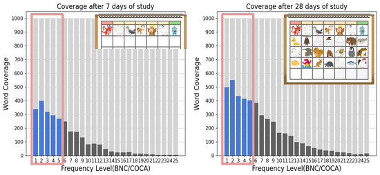 Coverage rate results for the British National Corpus (BNC)/Corpus of Contemporary American (COCA) datasets. The left side shows the vocabulary that can be learned when using seven types of animal avatars (assuming a different avatar each day for a week) and the right side shows what can be learned when using 28 types of animal avatars (assuming a different avatar each day for a month). Dark blue and gray represent learnable vocabularies, whereas the light gray indicates the remaining vocabulary that cannot be covered.