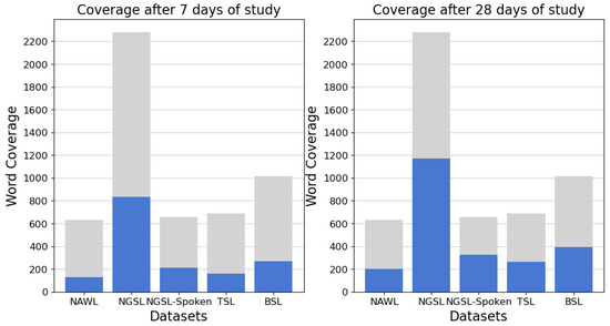Figure 15 shows the coverage rate of each NGSL dataset when learning with NariTan for one week or four weeks. It was shown that approximately 40% of NGSL could be covered after one week of learning, whereas approximately 20–30% of the other datasets could be covered. After four weeks of learning, approximately 50% of NGSL and NGSL Spoken were covered, whereas approximately 30–40% of the other datasets were covered.