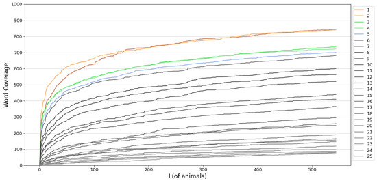 The results showing which level of words from the 25,000 words in the BNC/COCA dataset can theoretically be covered by this method. This indicates the coverage rate when learning words by assuming the role of all avatars in WordNet’s animal category. There are 25 series, each containing 1000 words.