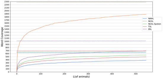 In this experiment, we considered the upper limit to be 543 avatars, corresponding to the number of words in the animal category of WordNet. Figure 16 shows the coverage rate results when the number of avatars is increased up to this upper limit. This figure shows the coverage rate for each of the 25 levels, where each level is a group of 1000 words ordered by frequency from the 25,000 words in the BNC/COCA dataset. It can be observed that words at higher frequency levels were mostly covered, whereas those at lower frequency levels were more difficult to cover. Therefore, this method is not suitable for covering low-frequency words, and a different learning method is required to cover these vocabulary levels. Similarly, Figure 17 shows the theoretical coverage rate of NGSL. It can be seen that approximately 80% of the vocabulary in NGSL and NGSLSpoken can be covered; however, for other datasets, the coverage rate plateaued at approximately 50%.