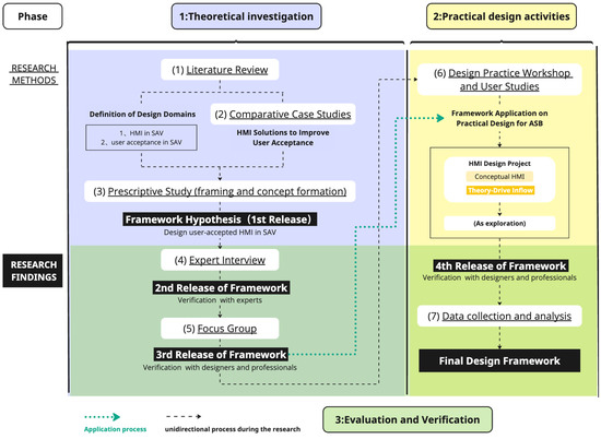 The guiding approach of this study is Research through Design (RtD) [20], which means doing design as part of doing research. This research follows a conventional trajectory from exploration (proposing hypotheses through theory) to design practice (developing to evaluating) and subsequently to reflection and analysis (validating and adjusting the hypotheses). Specifically, this research concerns designing HMI so that SAV can better transfer information to users. In doing this, authors used the literature to draft a design framework (see Section 3) guiding designers in paying greater attention to user acceptance-related factors during the analysis process, so as to design a user-acceptable HMI for SAV usage scenarios.