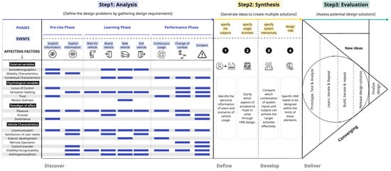 - Synthesis phase involves a brainstorming process, which requires designers to generate multiple targeted design approaches and solutions after consolidating user requirements collected during the analysis phase, thus enriching design ideas. Following Morrison et al. (2019) [32] and Zheng et al. (2022) [33], we put forward a four-step process that could assist HMI researchers in developing design concepts: (i) specify the subjects; (ii) target activities; (iii) system interactivity; (iv) design HMI for predefined elements. The four steps should be developed from the user acceptance perspective.