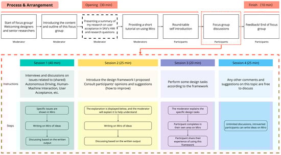 The focus group consisted of four separate sessions, with their discussion topics interconnected and progressively structured, including specific design tasks assigned to participants. The entire process is illustrated in Figure 3 below.