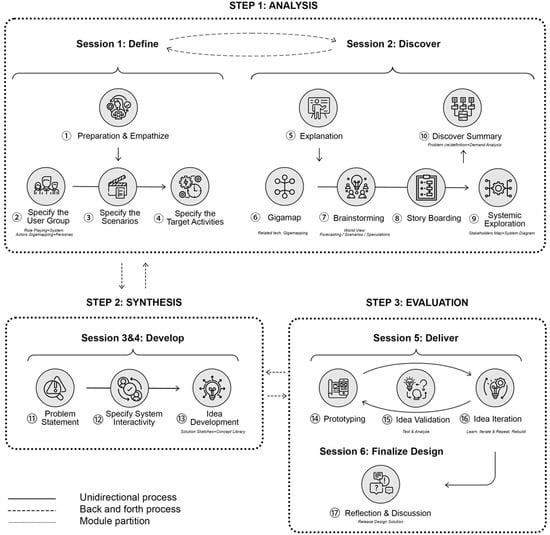 The workshop, with the assistance of an educational institution called “Alien Design Studio” in China, recruited 30 participants aged 20–27 (21 females and 9 males), comprising 16 students from design disciplines—10 undergraduate students and 6 graduate students—5 graduate students from other disciplines, and 9 designers currently employed at automotive companies. The workshop spanned one month from February to March 2024, divided into 6 sessions—Define, Discover, Develop, Deliver, and Finalize (see Figure 4), each requiring 8 h of participation. After the workshop, a combined quantitative and qualitative data collection method was used to gather feedback from the participants on their design projects developed through the framework, as well as to collect their insights regarding the guiding role of the framework.