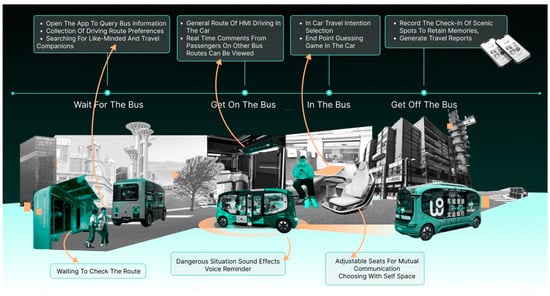 Transformative changes are occurring in public transportation systems with the introduction of new vehicle technologies such as automated driving, electric vehicles, Internet of Things (IoT), and the emergence of the concept of Mobility as a Service (MaaS) [1]. Autonomous driving technology (AD) plays a transformative role in public transportation by improving traffic flow, reducing accidents, and enhancing sustainability, though its full potential depends on overcoming safety, acceptability, and regulatory challenges in complex urban environments [2]. Shared Autonomous Vehicles (SAVs), a subset of Autonomous Vehicles (AV) [3,4], have the potential to expand existing schedule-based forms of transportation with flexible on-demand mobility options in sustainable and individual solutions. This study focuses on SAVs for transporting people, also known as Automated Shuttle Bus (ASB), as opposed to SAV for transporting goods, which are beyond the scope of our research. The SAE International Standard J3016 (2019) [5] provides a detailed classification of autonomous driving technology levels, stating that levels 1–3 require a human driver, while levels 4 and 5 permit autonomous operation within a defined range or without geographic limitations. The majority of ASB are currently at SAE level 4 and above [6]. Being a medium facilitating information exchange between SAVs and users [7], HMI [8] is responsible for transposing the computer’s internal information into external information that users can receive and that can be considered the system’s ‘face’ toward users [9]. Designing HMIs for autonomous driving is an emerging field guided by the principles of user interface design.