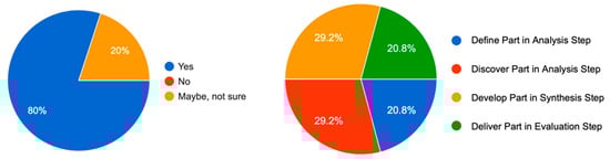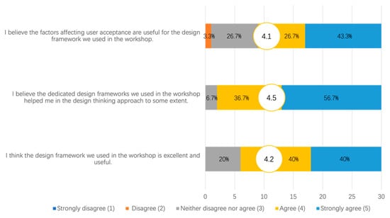 The questionnaire consisted of three parts. The first part briefly introduced the survey’s purpose and collected participants’ personal information, including gender, age, field of study, and primary responsibilities within the team, etc. The second part used multiple-choice questions and 5-piont Likert scales to gather respondents’ perceptions of using the design framework during the workshop. Figure 8 shows that participants are generally satisfied with the design framework; they acknowledge its practicality and believe that it helped their design thinking approach to some extent. Furthermore, participants found that the design framework can serve as an appropriate design approach to help them enhance user acceptance of HMI design for SAVs. This effect is most pronounced in the discovery phase during the analysis steps and in the development phase during the synthesis steps. Figure 9 depicts this. However, the participants suggested adding a definition of each factor that may influence user acceptance and some advice on how to handle it in the design process. This means that we should provide the framework with a manual instruction to guide designers on its usage.