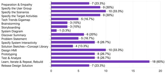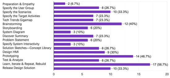 The third section employs a combination of multiple-choice questions and open-text responses to gather participants’ viewpoints on the influence of interactive design activities and tools utilized during the workshop. Figure 10 and Figure 11 visually display the results from the online questionnaire, representing the participants’ viewpoints. Participants have the liberty to choose any combination of activities/tools. In the scenario where all 30 participants select the same activity, the statistical representation would reveal a 100% response rate for that activity. Moreover, the percentage depicted in the graph signifies the ratio of survey respondents who opted for a specific activity relative to the total survey participants (30 individuals). Overall, the survey results indicate that participants are highly attentive to specifying the target user groups, usage scenarios, and particular activities during the execution of specific design tasks. However, after the design phase, they are more inclined to further explore how the prototype development and testing processes contribute to iterating and validating the design outcomes.