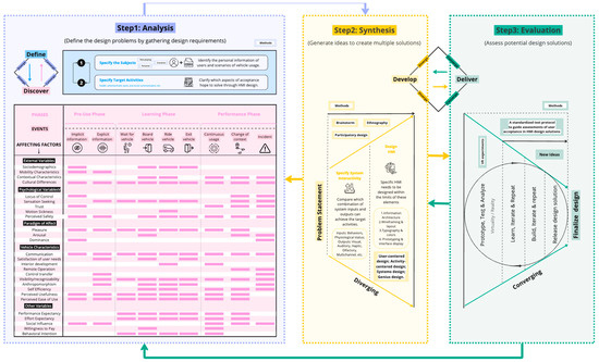 To sum up, the final version of the design framework adheres to the four stages of the Double Diamond model [40]—define, discover, develop, and deliver—clearly illustrating how steps (1), (2), and (3) contribute to the overall process. In the analysis phase, the discovery and definition stages mutually reinforce each other in a continuous cycle, facilitating the early design analysis. During the discovery stage, the SAV scenario is divided into nine distinct events, which are further categorized into three phases: Pre-Use Phase, Learning Phase, and Performance Phase. The 27 factors that potentially influence user acceptance are then evaluated within these events and classified into five main categories: external variables, psychological variables, vehicle characteristics, paradigm of affect, and other variables. This method enables designers to develop a comprehensive understanding of typical SAV interactions and promotes deeper reflection on how user acceptance may affect specific interactions. The define stage focuses on identifying users, usage scenarios, and target interaction activities to gather design requirements and clearly articulate the design problem. Subsequently, the synthesis step emphasizes the development of multiple HMI design solutions, addressing the problem statement through the specification of system interactivity. After generating HMI solutions, the evaluation step assesses the feasibility and effectiveness of these solutions, utilizing VR technology for simulation and testing, either preparing the concept for launch or fostering the creation of new design ideas.