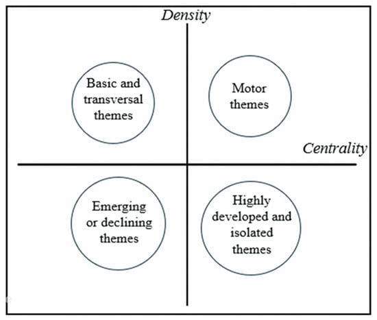 Strategic diagrams are employed to examine the evolution of core themes, with centrality on the X-axis and density on the Y-axis (see Figure 1). The performance analysis assesses literature production by analyzing centrality and density, with relationships graphically represented in Cartesian coordinates. High centrality, for instance, may indicate a theme’s strong relevance to various subfields, suggesting it is a point of convergence within the broader research network. Conversely, themes with high density but lower centrality may represent more specialized or isolated areas of inquiry that, while relevant, may have less connectivity with broader research trends.
