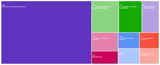 The analysis of the data indicated a greater concentration of studies in “Education Research” (654). It highlighted the lack of a social studies research approach in this field. The most relevant journals publishing papers on this topic are the following (Figure 2): Sustainability (22); BMC Public Health (17); Education Sciences (16); PLOS One (14); BMC Medical Education (14); Bordon-Revista de Pedagogía (11); Physical Education and Sport Pedagogy (11); International Journal of Inclusive Education (11); Teachers College Record (10); International Journal of Sustainability in Higher Education (10).