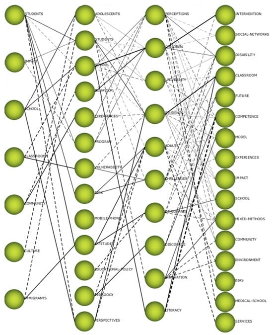 During Period 4, a significant shift is observed in the motor themes of research, now including “social networks”, “classroom”, “intervention”, “future”, “competence”, and “disability” (Figure 9). This evolution suggests that research began to explore the impact of artificial intelligence (AI) in more nuanced contexts, such as its role in fostering social networks, enhancing classroom interventions, and supporting students with disabilities.