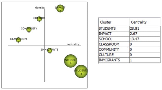 Adapted strategic diagram representing the cluster of a specific network, based on centrality (X-axis) and density (Y-axis) [].