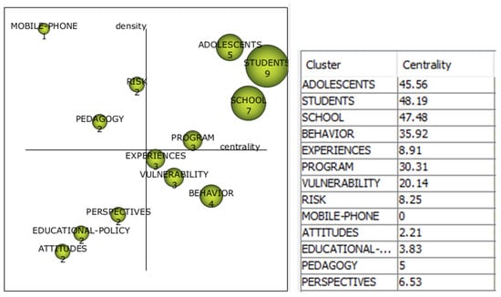 The motor themes are “adolescents”, “students”, “school”, and “programs”, while “experiences”, “vulnerability” and “behavior” are highly developed and isolated themes, and “mobile phone”, “pedagogy” and “risk” are basic themes. Emerging themes are “perspectives”, “educational policy” and “attitudes”.