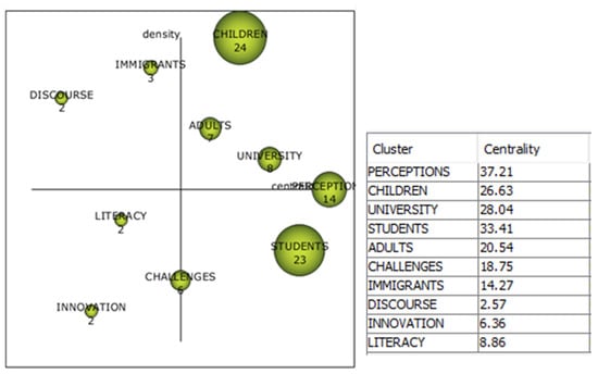 The motor themes are “children”, “adults”, “university”, and “perception”, while “discourse” and “immigrants” are basic themes. Emerging themes are “literacy”, “innovation” and “challenges”. A highly developed and isolated theme is “students”.
