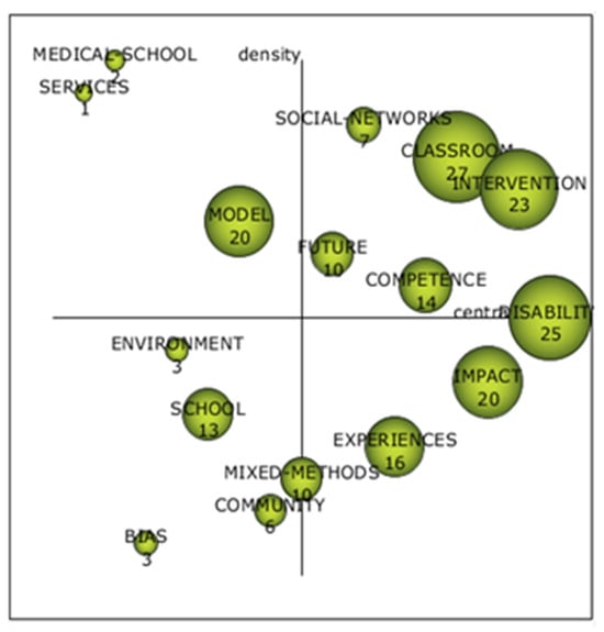 The motor themes are “social networks”, “classroom”, “intervention”, “future”, “competence” and “disability”, while “medical school”, “services” and “model” are basic themes. Emerging themes are “environment”, “school”, “mixed methods”, “bias” and “community” (returning themes). Highly developed and isolated themes are “impact” and “experiences”.
