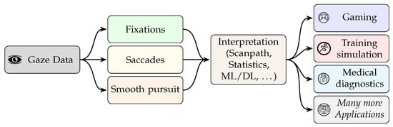 Starting with the question: How is gaze data used in interactive systems, especially in immersive environments? Gaze data is typically collected by eye-tracking devices, which record eye movements and determine the direction of the user’s gaze. The raw gaze coordinates collected over time are then processed to provide meaningful insights into gaze behavior. For example, algorithms analyze the duration and stability of the gaze at specific coordinates to determine whether a user is fixating on an object, following a moving target, or directing their gaze to a new point of interest. These inferred behaviors, including fixations, smooth pursuits, and saccades, provide fundamental data that can be used to calculate higher-level metrics. Such interpretations of gaze data are essential for applications in immersive environments, as they enable interactive systems to respond to the user’s focus and intent, creating a more natural and intuitive communication interface. A summary of that pipeline is shown in Figure 1. Despite progress, many issues remain, such as identifying key features for interpreting gaze in unaffected environments and developing robust real-time analysis methods; increasingly, AI is being used to overcome these challenges and enable learning with minimal supervision and adaptability to real-world conditions [].