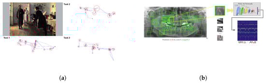Examples of scanpath analyzes. One of the first published scanpath analyses was by Yarbus [] An example can be seen in (a) which illustrates scanpaths of a Yarbus-like measurement by Geisler et al. [], where the participants see the same images, but the task was different: Task 1 Indicate the age of the subjects. Task 2 Remember the clothes the people are wearing. Task 3 estimate how long the visitor was away from the family. This showed that the scanpath depends on the task. This knowledge can now be transferred to deep learning architectures, as shown in (b), a visualzation of the analysis by Castner et al. [], where the scanpath is reconstructed based on the fixation data and visualized using a VGG-16 network to compare the similarity of fixations.