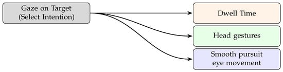 Moving forward, we address the question: How can gaze be used effectively as an interaction tool, and what challenges does this pose? By combining gaze data with scene data, eye-tracking systems can accurately identify the user’s object of interest, enabling direct communication of it to the system. This capability opens up a wide range of applications: For example, gaze can facilitate tasks such as text entry, navigation through menus or interfaces or—especially in immersive environments—the selection of objects in augmented or virtual reality. However, the use of gaze as an interaction tool brings with it unique challenges. One well-known problem is the so-called Midas Touch problem, where unintended decisions are made simply because the user is looking at an object. To solve this problem, various approaches have been developed to ensure that gaze-based interaction is precise and intentional (see Figure 3). These solutions typically involve using gaze to select the target while requiring confirmation through an additional input, such as a head movement or an external control (e.g., a hand gesture or voice command). This multimodal approach helps to avoid accidental actions and makes gaze-based interaction more reliable and intuitive for users []. By utilizing these strategies, gaze-based systems can create responsive and engaging experiences for various applications, from hands-free control of devices to seamless interaction in immersive environments.