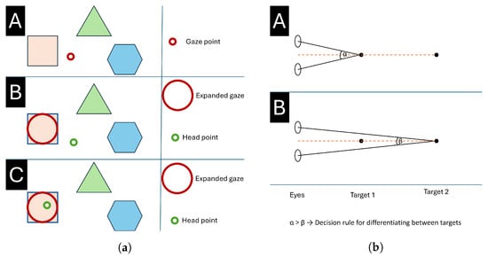 Another approach to enhancing gaze-based interaction is to combine both head movements and eye gaze for more accurate and efficient target selection. This integration leverages the strengths of each modality, offering greater control and reducing errors. Sidenmark and Gellersen [] explored this combination by developing three distinct interaction methods that utilized both head-supported versus eyes-only gaze (Figure 4a). In their study, participants were tasked with answering questions by selecting from four multiple-choice options. Their results show that eye and head techniques enable a new type of gaze behavior that gives users more control and flexibility in rapid gaze alignment and selection. Wei et al. [] took this integration further by introducing a probabilistic model that combines head and eye gaze endpoints to improve target selection accuracy. Rather than simply using a binary selection based on dwell time or direct gaze, their approach calculated the probability of selecting a particular target based on the distribution of both head and gaze positions. By analyzing where both modalities converge, the system could estimate which target the user was most likely focusing on. This probabilistic approach reduced the likelihood of incorrect selections due to slight variations in gaze or head movement, making the interaction more reliable in complex environments with multiple selectable objects. These methods demonstrate that combining head movements and eye gaze can significantly improve interaction accuracy, speed, and user satisfaction, particularly in immersive scenes where precise control is essential. The integration of these modalities not only addresses the limitations of using gaze or head movement alone but also opens new possibilities for more fluid and intuitive interaction in virtual and augmented reality environments.
