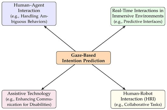 Summary of areas of application for gaze-based intention prediction. These applications span across various domains, including human–agent interaction, immersive environments, assistive technology, and human–robot interaction.