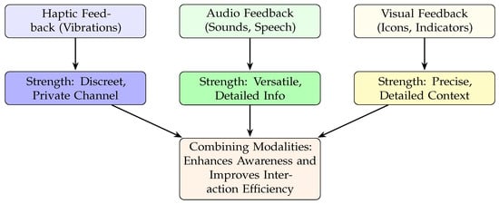 These studies underscore the complexity of feedback design, particularly in gaze-based or interactive systems. While visual feedback can provide detailed and context-rich information, its effectiveness varies depending on the task at hand. Combining it with auditory or haptic feedback often enhances user experience by supporting the strengths of each modality (Figure 6). Therefore, a deeper investigation into how these feedback mechanisms interact is essential to optimize user performance and satisfaction across various types of virtual environments and applications.