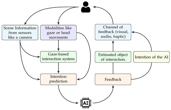 Gaze-based intention prediction has diverse applications in communication across different domains (Figure 5). One notable application is in human–agent interaction, where understanding a person’s intention is crucial, especially when dealing with ambiguous behaviors. Singh et al. [] introduced a model for online human intention recognition that integrates gaze data with model-based AI planning. Their findings suggest that this approach could enhance human–agent interaction, particularly in scenarios where the person’s behavior might be uncertain, such as when they are being honest, deceitful, or semi-rational. This is even possible without directly classifying these behaviors, as gaze data can provide insights into the underlying cognitive processes and user behavior. This model could be instrumental in designing more adaptive and responsive systems that can handle these complex human behaviors.
