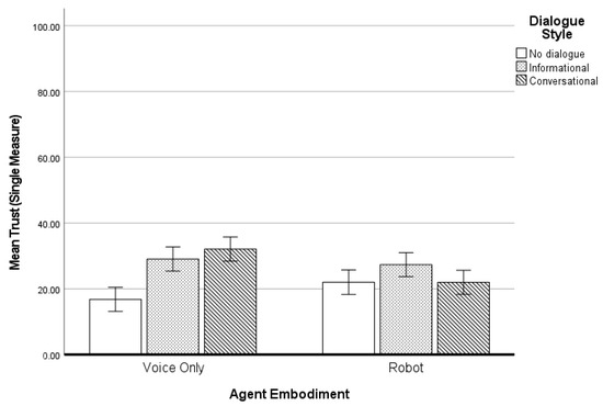 Mean ratings of trust (single measure) across agent embodiment and dialogue conditions. Error bars are ±SE.