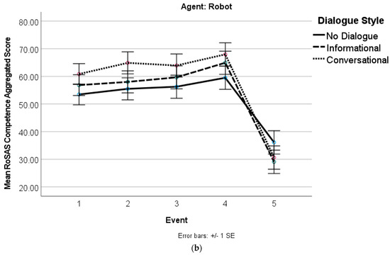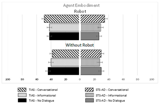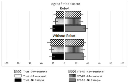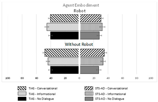 STS-AD (Figure 6): Reliability between items was high (α = 0.86). There was a non-significant main effect of robot presence, F(1,193) = 0.11, p = 0.74, and dialogue style, F(2,193) = 0.76, p = 0.47, and a non-significant interaction, F(2,193) = 0.62, p = 0.54.